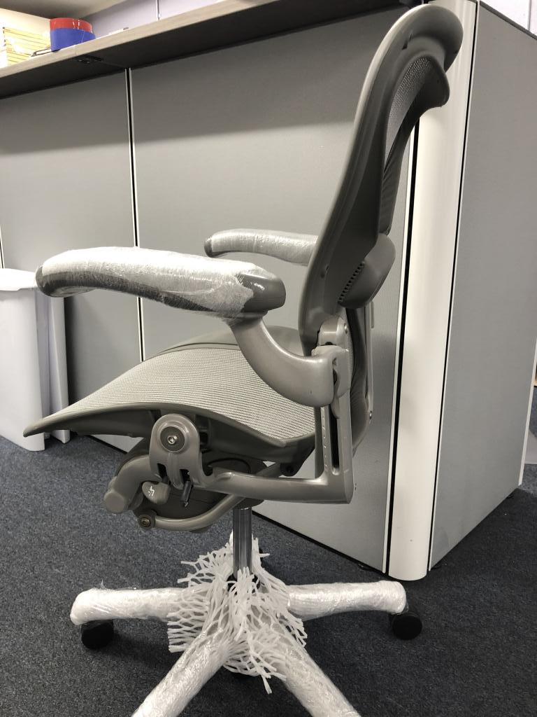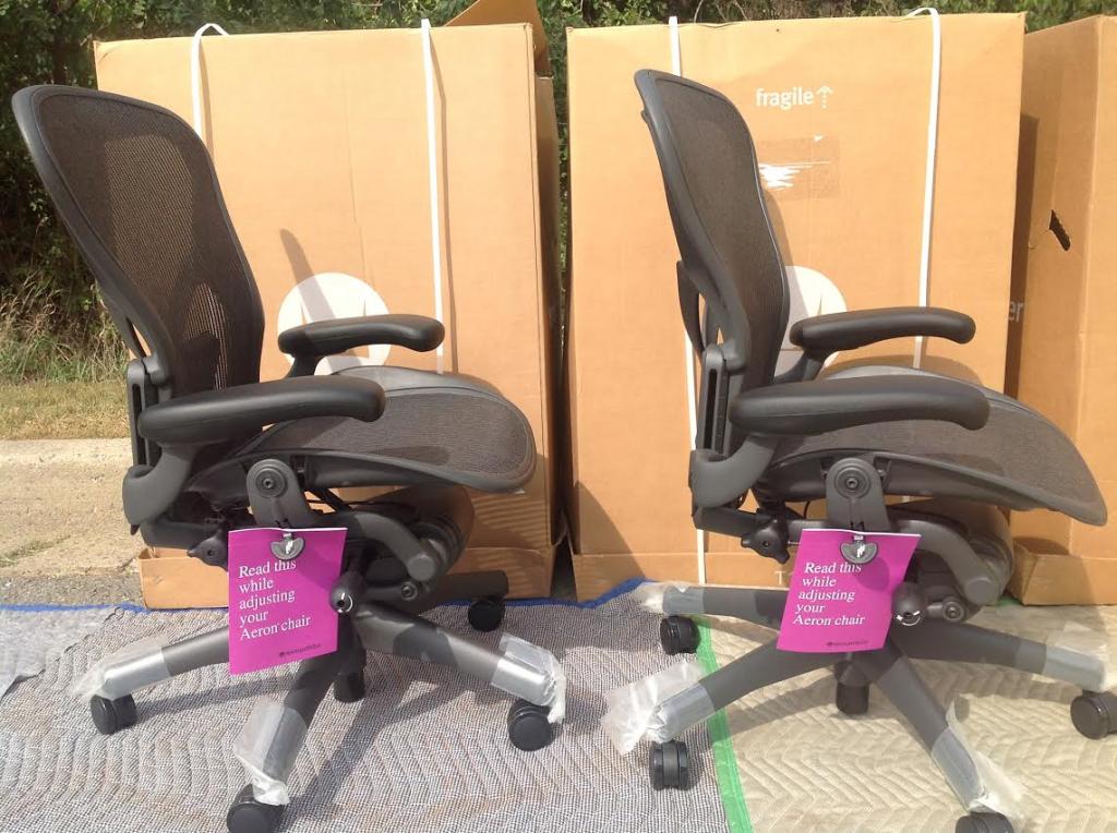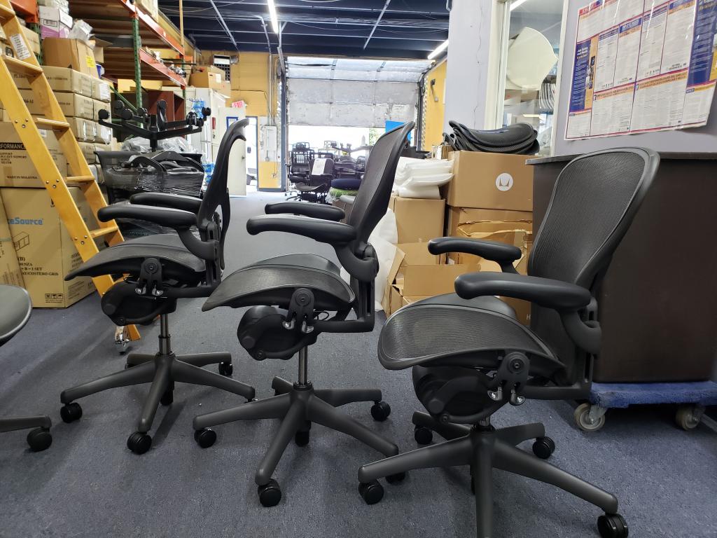 Description Herman Miller Aeron chairs in stock and ready to go. Sizes B's and C's. All chairs are fully loaded with Original all features available. All older chairs have been completely checked out and any broken parts replaced by our Mechanics with New original parts as needed. We also have Brand new replacement parts for the Aeron Chairs. Some Aerons Stools available in new condition also some Polished Aluminum Aerons in New Condition as well.