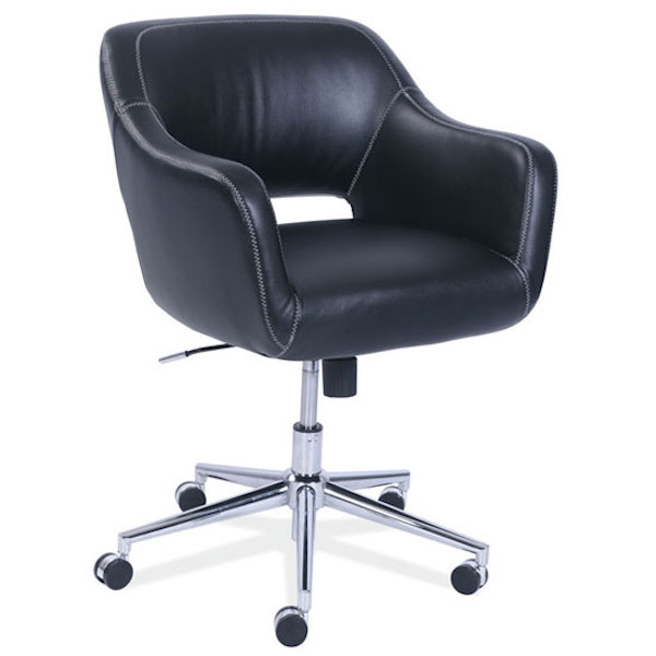 Description This super modern take on a conference room chair would be an exceptional addition to an office environment. With the smaller, chrome base, this chair would be prefect in areas that dont require a whole lot of footing. With its commercial grade black leather, you can lean back and make the decisions in true style!