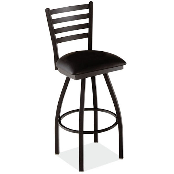 Description This more classical swivel barstool style is always a great choice for areas around the office with elevated tables. Works well at any raised work station, due to its 2.5 inches of high density foam seat. Built on a extremely sturdy steal frame, accented by the ladder style back rest, this stool will be a fantastic addition for the work space or common areas.
