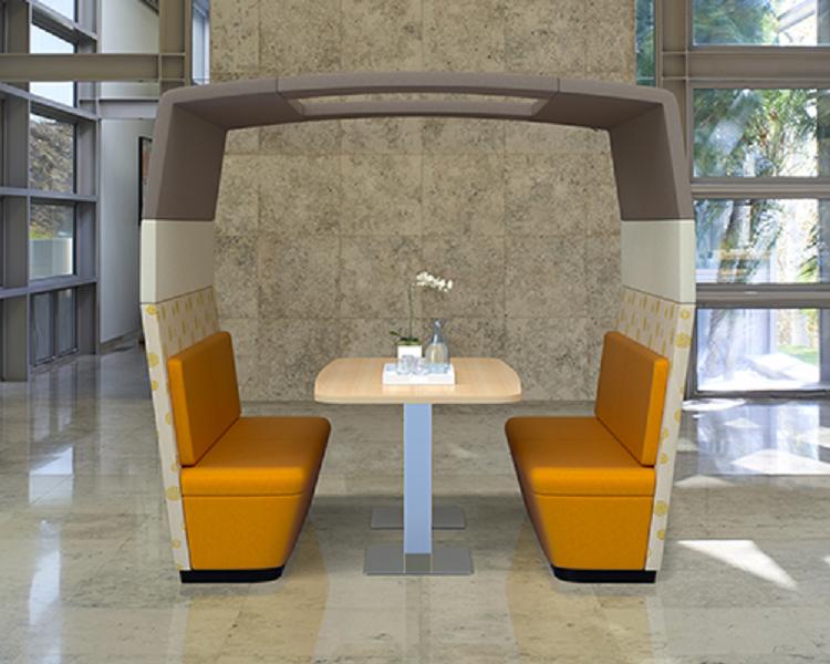 Description Taking its cue from the shared society of today, this collaborative private pod seating is all about bringing people together. Designed to function equally well in existing or new spaces, these open to semi-private meeting enclaves can be positioned anywhere and require no elaborate construction to create a custom built-in feel. Various colors, fabrics and forms to choose from.