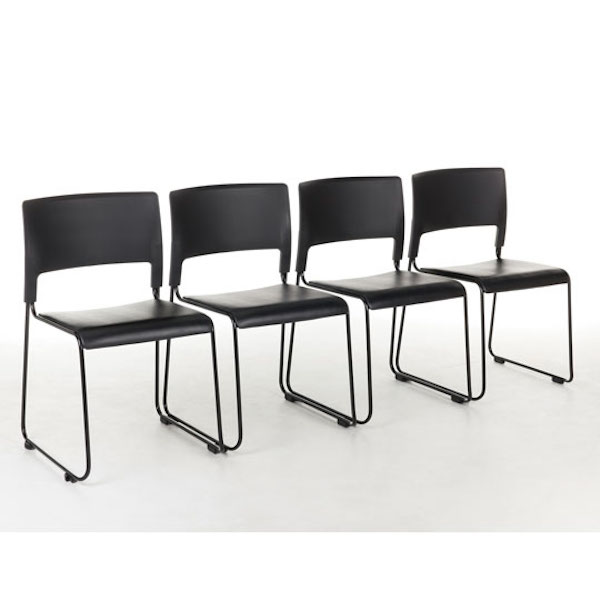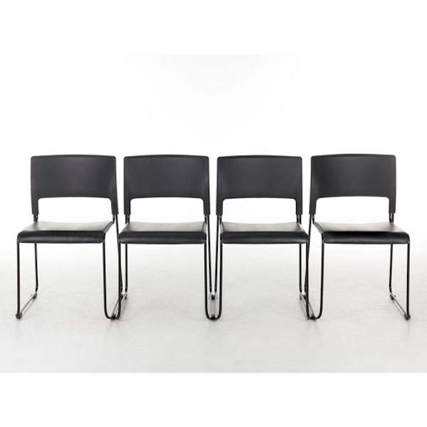 Description This armless stackable side chair, comes in a sleek black on black appearance. The bumpers on the base, add additional protection, keeping the floors scratch free. These stackable chairs, are able to be upholstered.