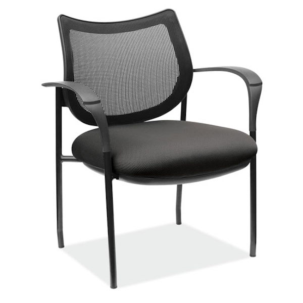 Description This guest arm chair is great for waiting areas and extra seating around the office. The durable black frame is accompanied by a mesh back rest for ventilation, and a ultra comfortable seat pad. Along with air circulation the curved mesh back, aides with lumbar support.