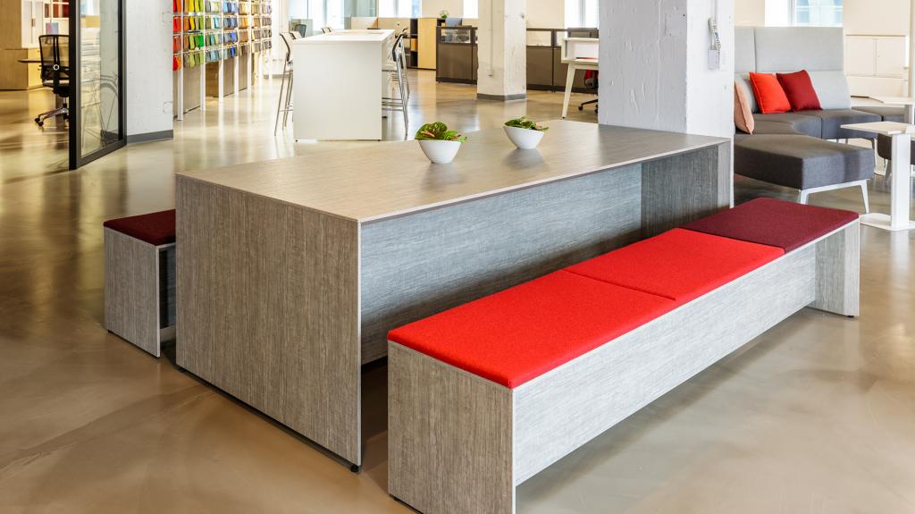 Description This brand new sleek meeting area includes: a 42" meeting table, (2) benches w/ (3) cushions per bench! Available Nationwide. ***FREE SHIPPING OVER $5,000