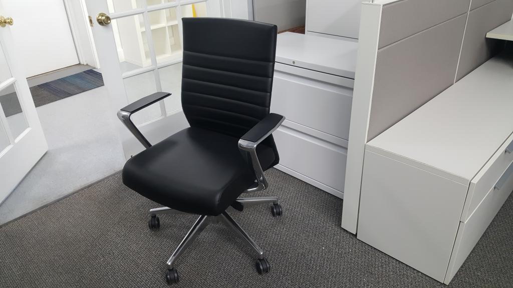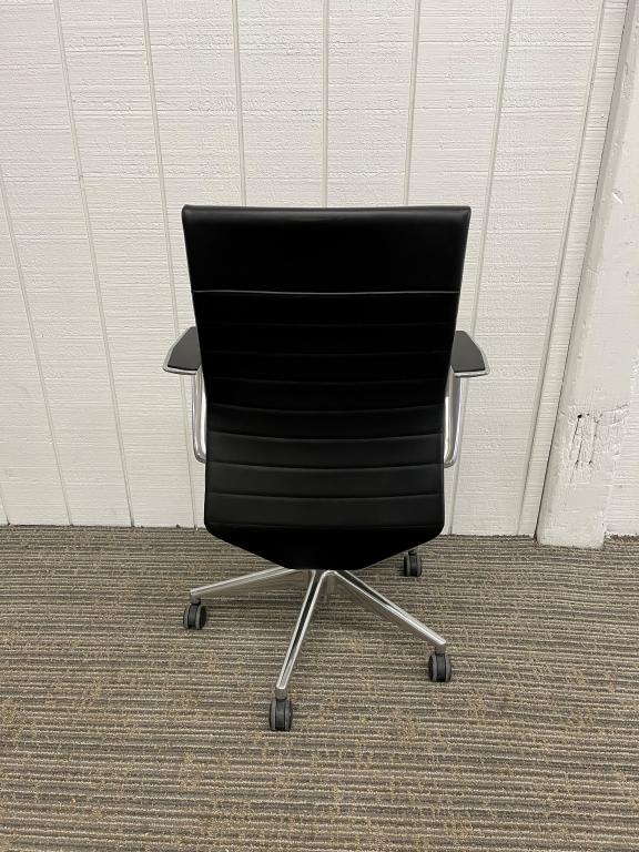 Durosoft black leather alternative back and seat. Polished aluminum base and polished aluminum armrests