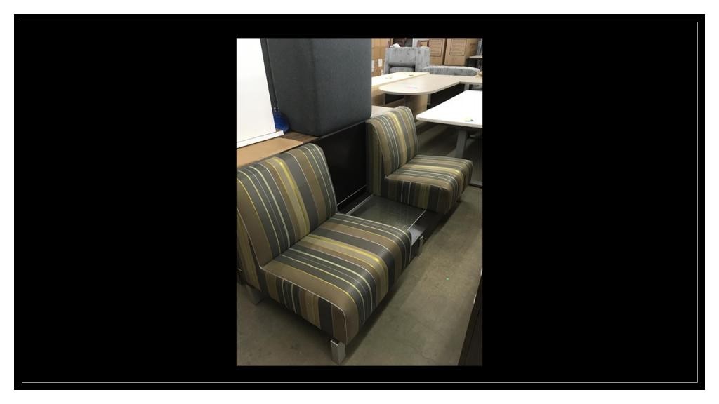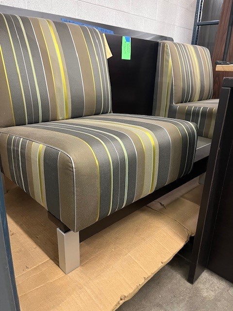 Description Used Sojourn Lounge by Gunlocke. This lounge is perfect for educational or lobby spaces. Seating has a nice striped print and between the seats is a built in table with a glass top. Very contemporary looking in browns and greys. Lounge is 72" long.