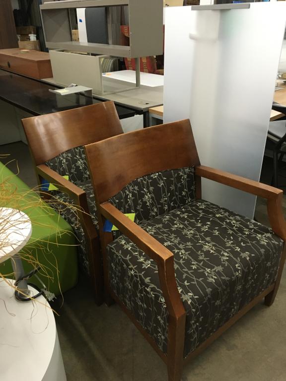 Description Used wood framed guest chairs. These chairs have a dark wood frame and black pattern seating. Sold individually or as a pair for $100 each. ** Local Delivery Only. We do not ship out of state. **