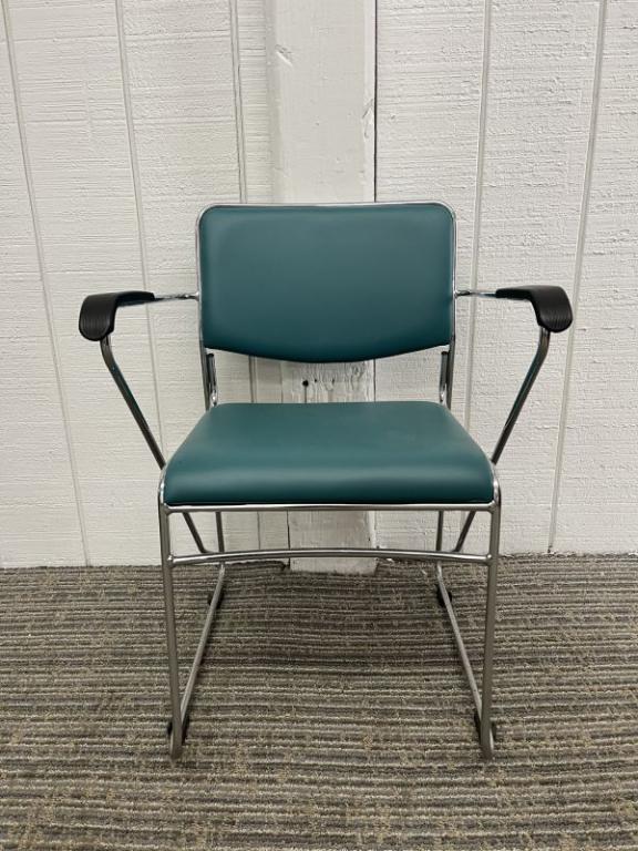 Description **New** Teal vinyl Fixed arms - black arm caps Stacking Chrome sled base