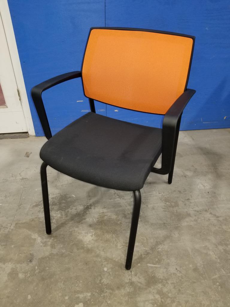 Description ****New showroom samples*** Stacking Orange mesh back Black frame Black seat with arms