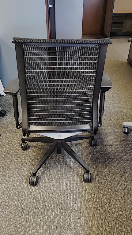 Description Now available pre-owned Steelcase Think chairs. Mesh back with black fabric seat. Arms are black and height adjustable.Goes great with cubicles, desks and conference room tables.