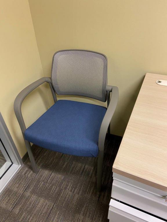 Description Allsteel Relate guest chairs. These chairs have a blue fabric seat, grey mesh back and arms. Perfect for extra seating in private offices, reception areas and anywhere in the office where extra seating is needed.