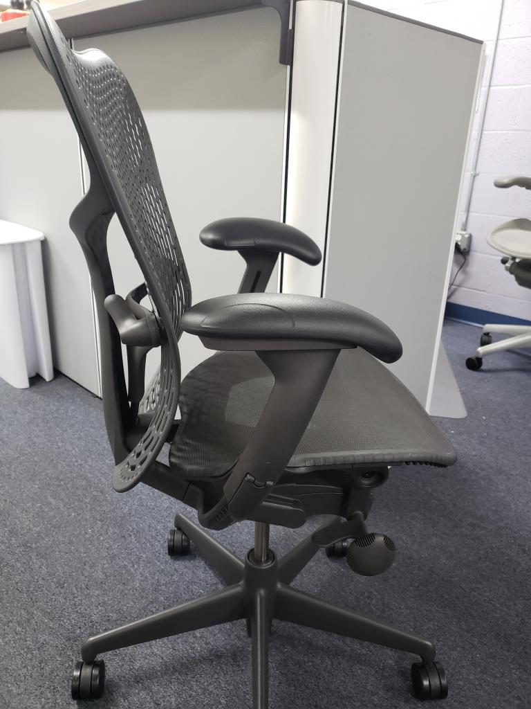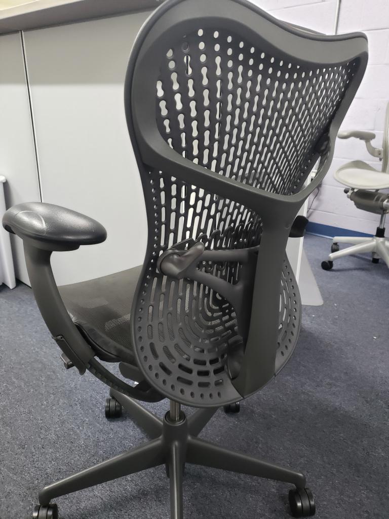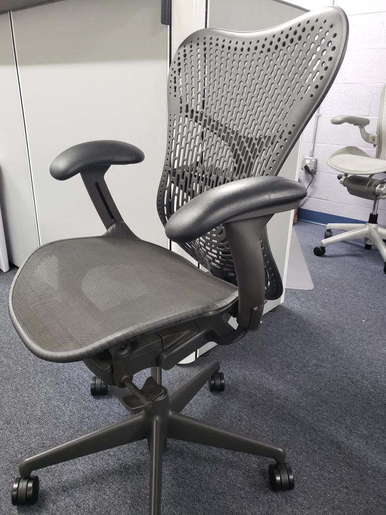 Description Herman Miller Mirra 2 Chairs, Charcoal / Graphite Color, Only 3 years old, & hardly used at all. Reconditioned w/ cleaning, factory paint touch up, & new Hardwood Castors. Fully Loaded with the following: Fully Adjustable Lumbar New Hardwood Castors Graphite Color Paint Touched Up Front Seat Lip Adjustment Forward & Rear Tilt Limiters Fully Adjustable up down arms & 4-way pivoting arm caps Upgraded Metal Base Not in DC? Here are more HM Chairs from our network: Used HM Chairs