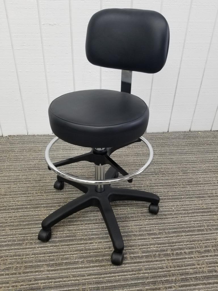 Description Source International Stool Black vinyl Armless Chrome base Chrome foot ring Seat Height Range: 23-33" Overall Height Ragne: 37-47"