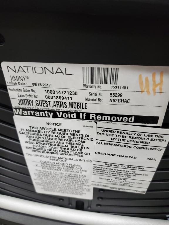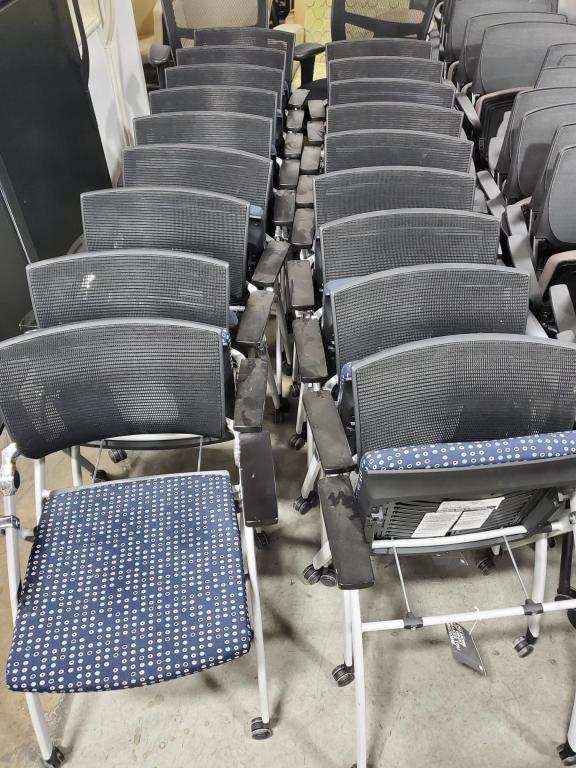 Description We have some nice looking National Jiminy mobile nesting chairs in stock! Great for collaborative meetings: you can fold up the seats & nest them together for when they're not in use. Black mesh back, silver frame, custom blue circle pattern seat fabric and comfortable arm pads. Call or email for your quote today!!