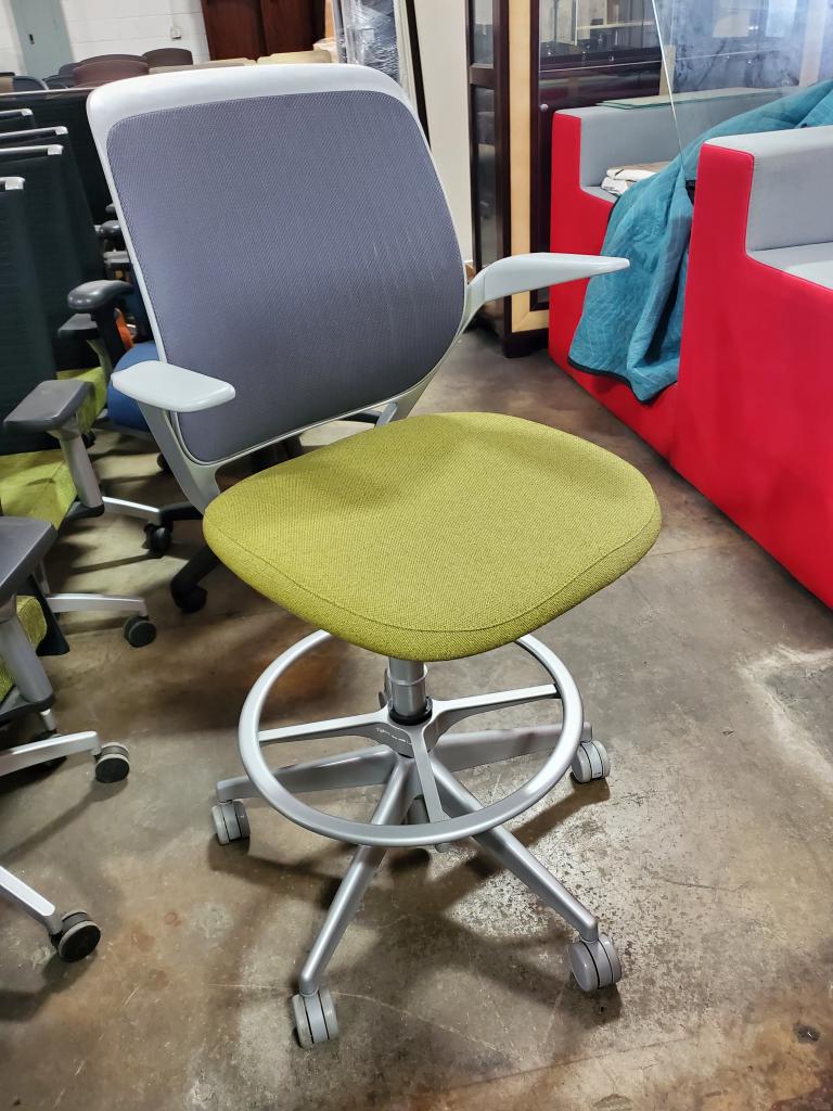 Description Steelcase Cobi drafting stools just arrived! Great shape!! Dark gray mesh back, light gray frame & sage green fabric seat. These won't last long! Call or email for your quote today!!
