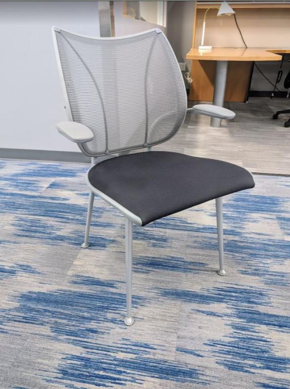 Description The Humanscale Liberty side chairs are a sleek modern design. Featuring a breathable mesh back in gray, with a slate blue seat, & platinum silver frame.