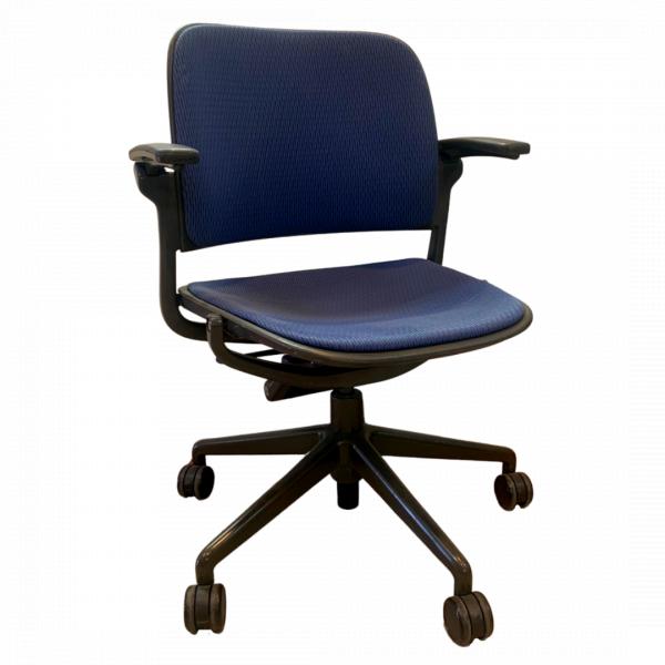 Description Steelcase Cachet chairs are easy to clean and extremely comfortable. These feature black frames and backs. Upholstery is blue. Back upholstery can be removed if the plain poly back is preferred.