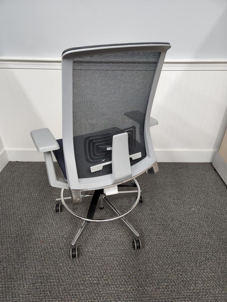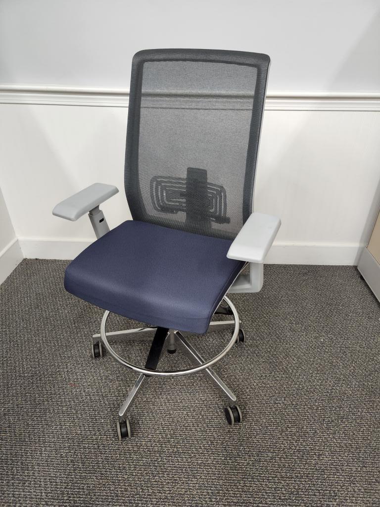 Blue/gray fabric cushion with black mesh back. Frame is light gray. Aluminum base and fixed arms. Grey hard casters for soft flooring surfaces.