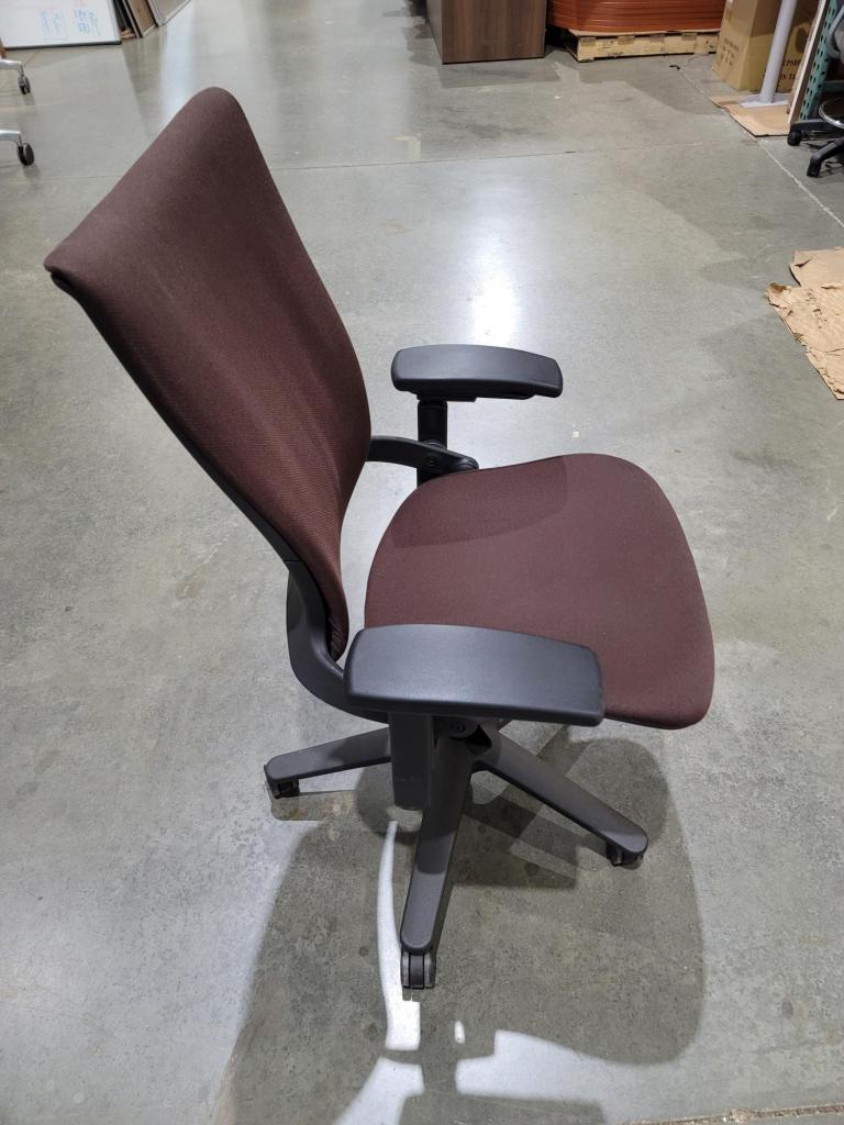Description Allsteel Sum task chair. Height adjustable arms, tilt lock, height adjustable. Brown fabric with black frame.