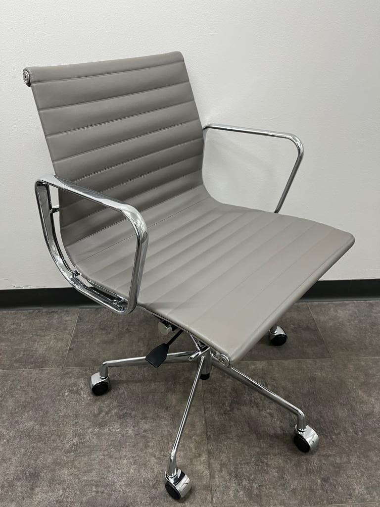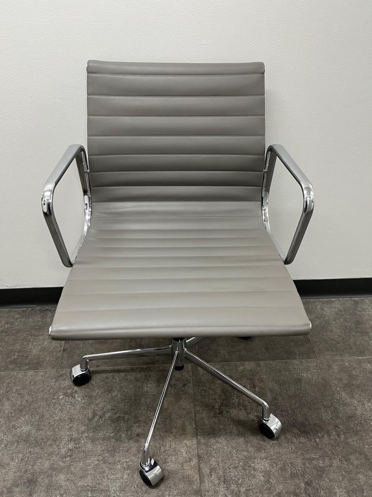 Description HERMAN MILLER EAMES REPLICA ALUMINUM GROUP SERIES EAMES ICONIC STYLING MID BACK SWIVEL TILTER TILT LOCK HEIGHT ADJUSTABLE GREAT CONFERENCE CHAIR GREY LEATHER CHROME FRAME 22.8"W x 23.2"D x 31.9" 35.2"H **NEW OPEN BOX**