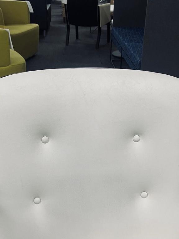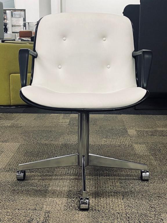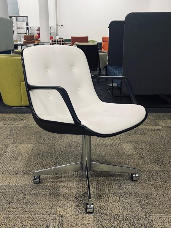Description Pre-owned Vintage 1980 Steelcase office chair, model 451. This mid-century inspired chair features an iconic bucket seat on a chrome base. White Leather upholstery. In the style of the famed Charles Pollock Chair. Dimensions: 27" W x 24" D x 32" H