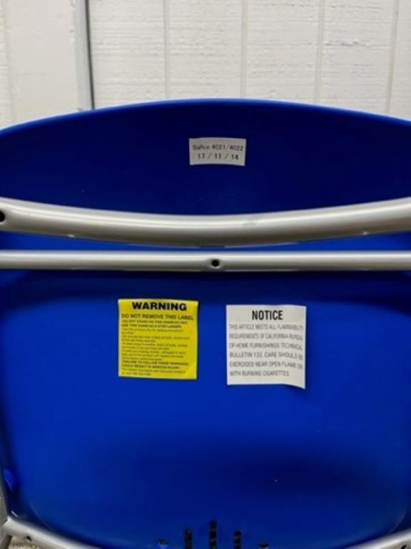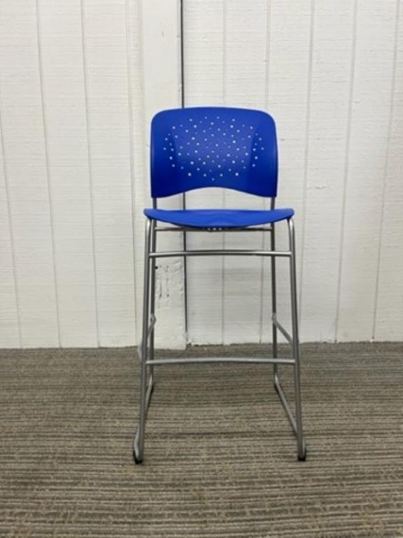 Description Blue poly seat & perforated back for breathability. Sled base w/ rounded back for added lumbar support. Sturdy silver frame. Chairs are stackable.