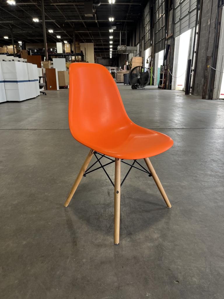 Description Now Available, The Eames Look-A-Like Plastic Side Chair in a captivating orange finish with a sleek and sturdy wood base. Upgrade your interior with this eye-catching and stylish chair! *WHS*