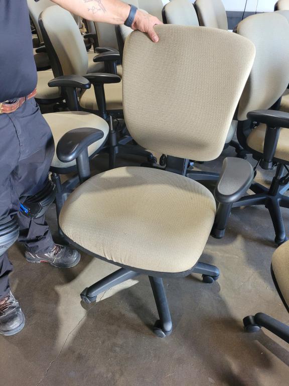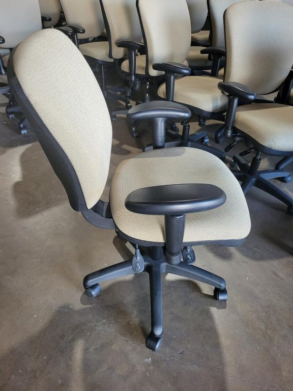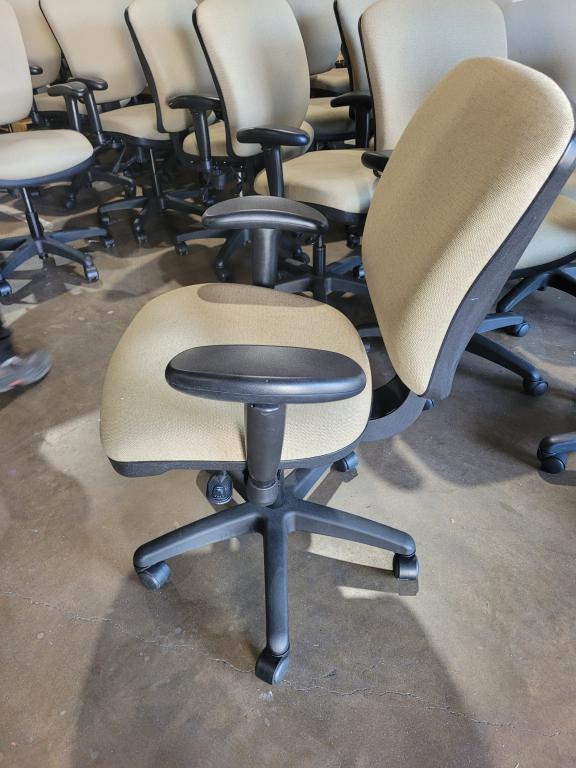 Description Mid back with height adjust back, seat depth control, full adjust arms, tilt lock, swivel and pneumatic lift. Tan fabric seat and back.