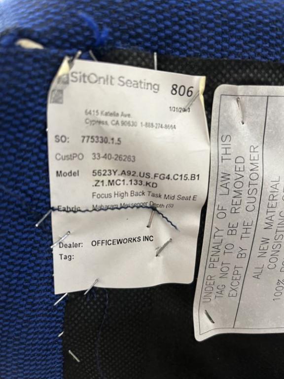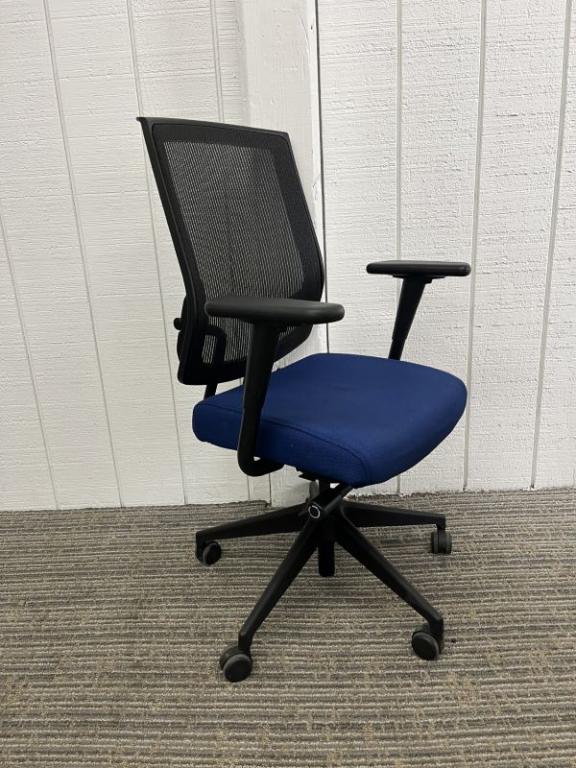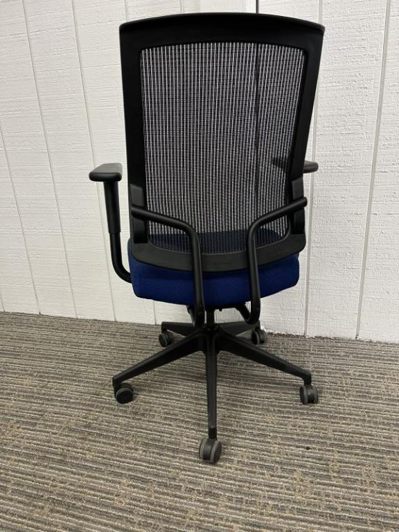 Description Sit On It high back task chair. Adjustable height. Blue seat with black mesh back. Frame is black. Chair Dimensions: 20" Wide x 19" Deep Height Range: 18 - 22" Seat Height; 38.5 -42.5" overall height.
