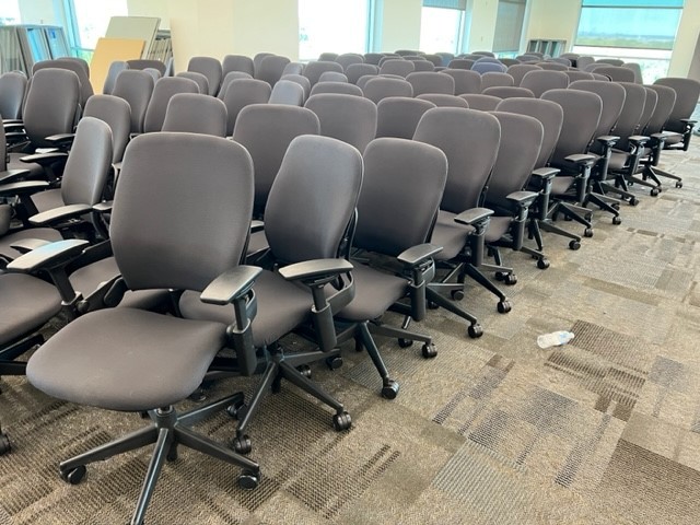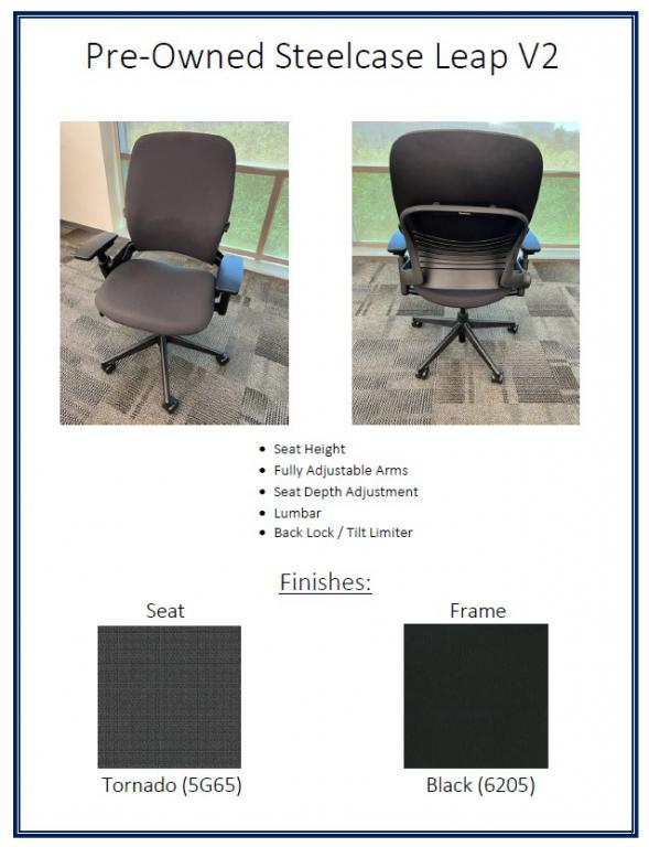 Description Pre-Owned Steelcase Leap V2 Chairs Qty Available: 900 2017 Mfg. Date Black Frame / Tornado Fabric (Dark Grey)