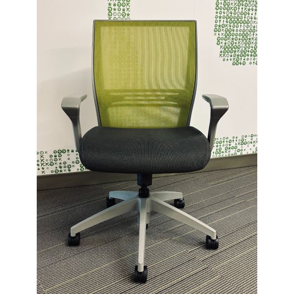 Description Pre-owned SitOnIt Amplify Mid-Back Task Chair. Grey frame and base, apple green mesh back and black fabric seat. Features Height adjustable, adjustable lumbar support, swivel tilt, fixed arms, and waterfall seat. Dimensions: 40" H x 27.75" W x 27.75" D.