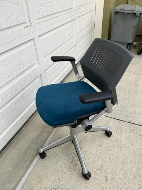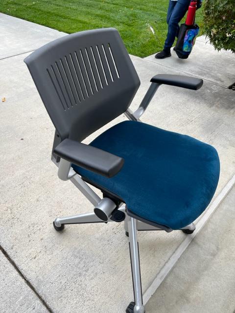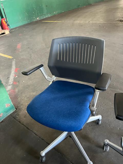 Description Avail. now Blue fabric = 30 qty. Blue velour (similiar color blue) = 12 qty. Seats flips up and nests. Seats flips down for sitting. Pneumatic lift. Hard Plastic Backing.
