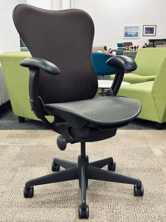 Description Pre-owned Herman Miller Mirra Task Chair with a Brown mesh fabric back and mesh seat, Graphite frame color. Features - Pneumatic Height Adjustable Seat / Height Adjustable Arms / Adjustable Arms / FlexFront Adjustable Seat / Swivel Arms / Tilt Lock / Adjustable Lumbar Support / Tension Control. Dimensions: 30" W x 18 1/2" D x 42 3/4" H