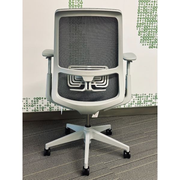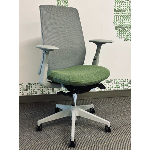 Description Pre-owned Haworth Soji Task Chair with a Grey mesh back and a Green fabric seat with a Platinum frame and a platinum colored 5 Star base. Features: Pneumatic Height Adjustable Seat / Height Adjustable Arms / Tilt Lock / Tension Control / Lumbar Support. Dimensions: 28" W x 27" D x 39" - 44" Overall Height.