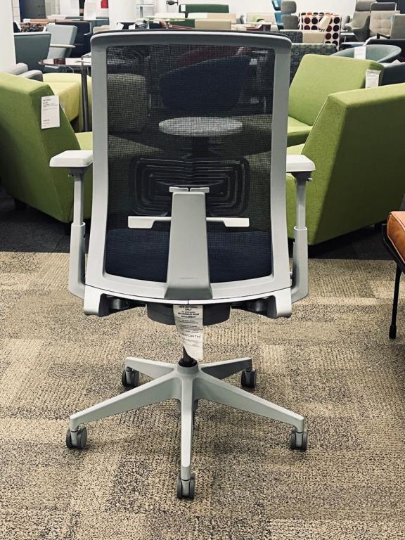 Description Pre-owned Haworth Very Task Chair. Grey Mesh back with a Blue upholstered seat and a silver 5 star base and frame color. Features: Pneumatic Height Adjustable Seat / Height Adjustable Arms / Tilt Lock / Tension Control / Lumbar Support. Dimensions: 27 1/4" W x 26" D x 45 1/4" H