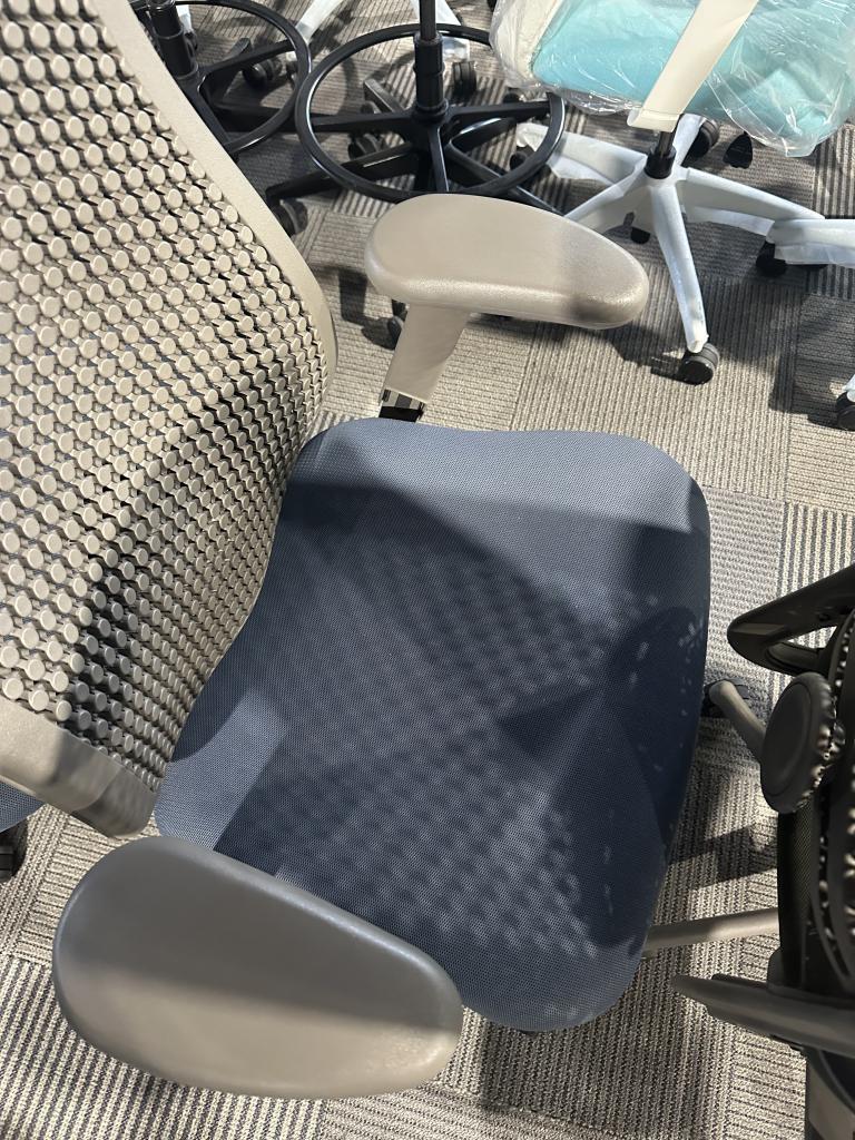 Description Herman Miller Celle Office Chair W/ Blue Fabric Seat and Gray Back Arms Adjustable Up/Down and Side to Side Chair Goes Up and Down Tension Control On Seat Tilt Control Seat adjustable Front To Back Built in Adjustable Back Support 50 Like This Available Please Note We Have These in Multiple Different Colors Will Do Discount Shipping on Multiples Shipping is High Because to ship this chair it takes not one but two boxes Used Chairs , Comes w normal wear and tear but in overall good working condition