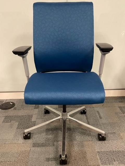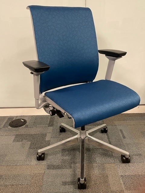 Description Pre-owned Steelcase Think Task Chair, Has a Blue speckled back and seat with a Platinum frame and 5 castered Polished Aluminum Base. Ergonimc Functions: - Pneumatic Height Adjustable Seat - Height Adjustable Pivot Arms - Seat Depth - Flexible Seat Edge - Tilt Lock - Tension Control - Comfort Dial. Dimensions: 28" W x 22"-22 1/4" Overall Depth - 37 1/2"-42 1/2" Overall Height