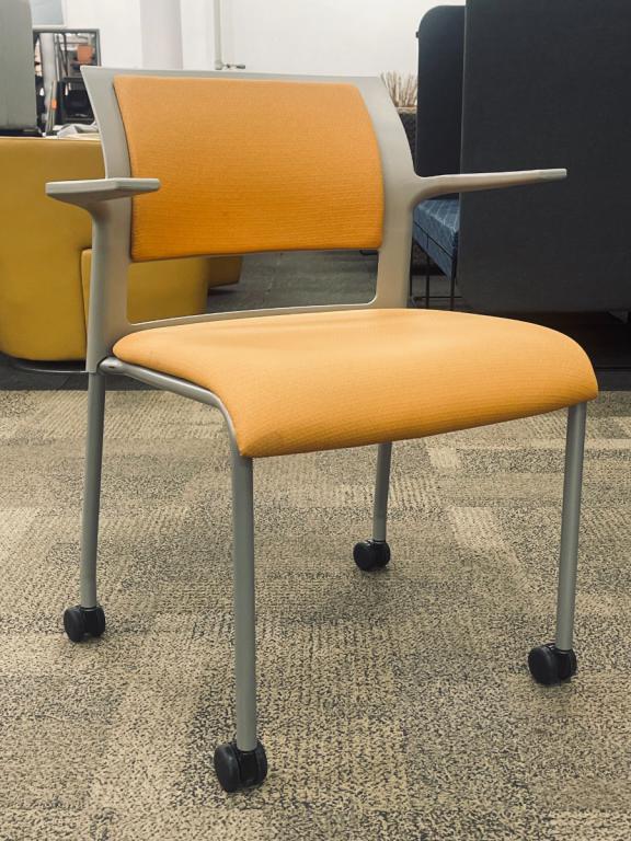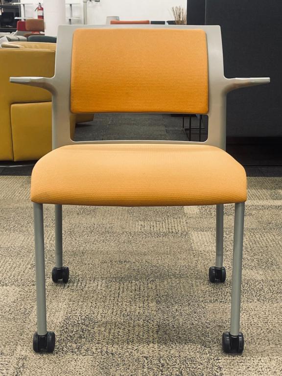 Description Pre-owned Steelcase Move Guest Side Chair w/ Caster's, Grey plastic back with an orange fabric insert on back and seat. Dimensions: 25 3/4" W x 20 1/4" D x 31 1/2" H