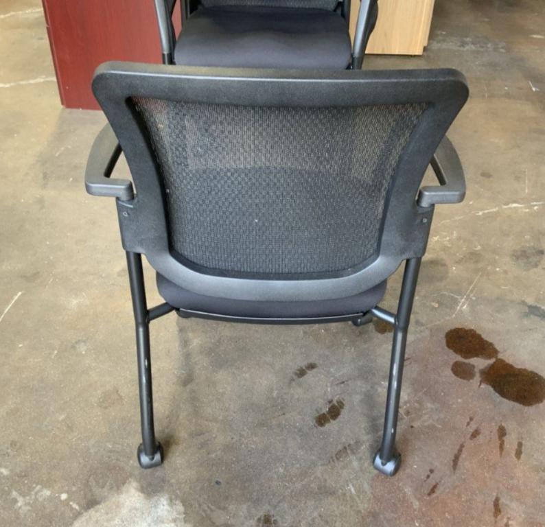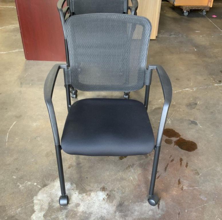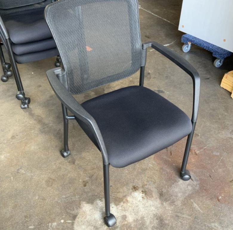 Description Stackable black side chairs with sturdy frame, arms, and casters. Mesh backrest and padded seat for comfort. These chairs are commercial grade to ensure longevity.