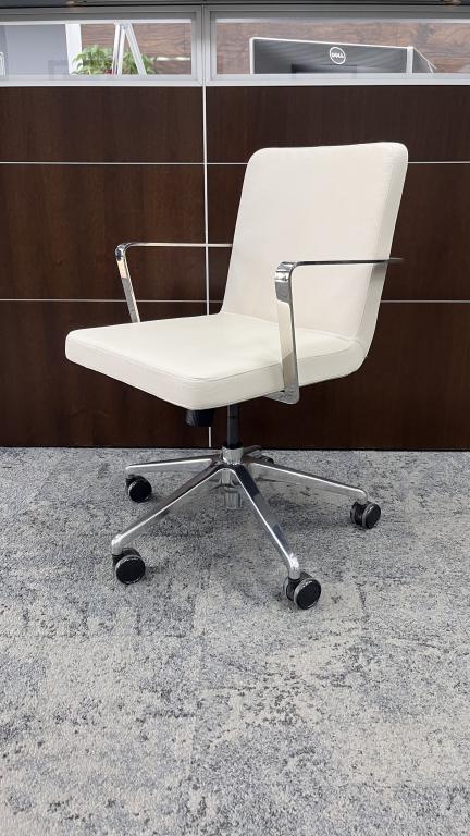 Description Now Available, Pre-owned conference chairs by Bernhardt, upholstered in white leather and complemented with sleek chrome arms and base. They are stylish, comfortable, and practical, featuring adjustable height, tilt, and swivel functions. These chairs combine both style and functionality for your workspace.