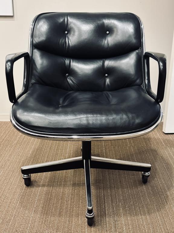 Description Pre-owned Vintage Knoll Pollock Executive chairs designed by Charles Pollock and manufactured by Knoll. The stylish armchair has sleek lines, star base, chrome detail and the original button tufting. The seat height is adjustable (approx. 18"-23"). A very comfortable tufted leather chair that works well at home or in a classic office setting. Finishes: Black Leather / Polished Aluminum base with a 4 star base. Dimensions: 27 W x 27" D x 31" H.