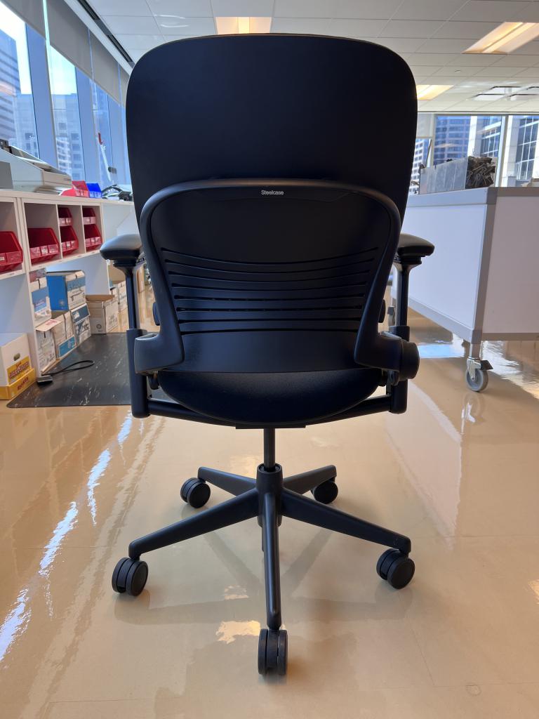 Description Pre-owned Steelcase Leap V2 task chair has Black upholstered body and a Black (6205) frame with a five-star castered base.