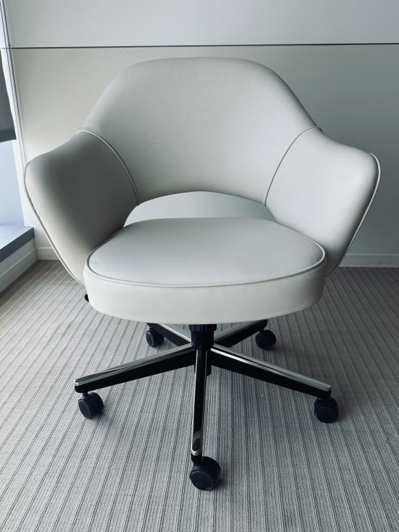 Description Pre-owned Knoll Saarinen Executive Chair. Sit back and relax with the Saarinen Executive Chair. The iconic design combines the exceptional comfort of Eero Saarinen’s sculptural form with a high-performance, height-adjustable swivel base with weight-adjusted tilt. Finishes: White Leather / Polished Aluminum. Dimensions: 26" W x 24 3/4" D