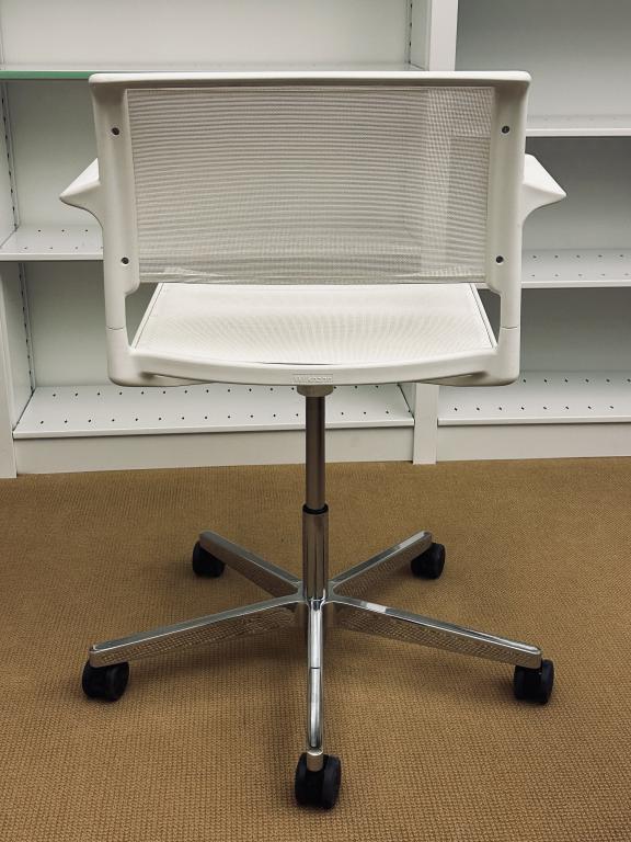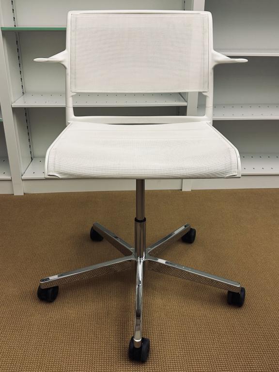 Description Pre-owned Wilkahn Aline Conference Chair. The Aline range is both coherent and innovative. The flexible design and color-matched high-efficiency perforated mesh fabric covering keeps your body cool, making sitting on the chair both relaxing and comfortable. Features: Pneumatic Height Adjustable Seat. Finishes: White Mesh Back and Seat / Polished Aluminum Frame. Dimensions: 25 1/2" W x 25" D x 15 1/2" - 20 1/2" Seat height, 30 - 34 1/2" H Overall height.