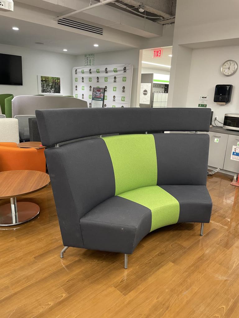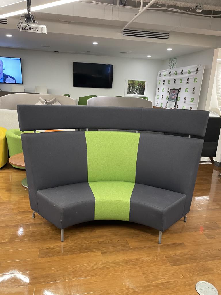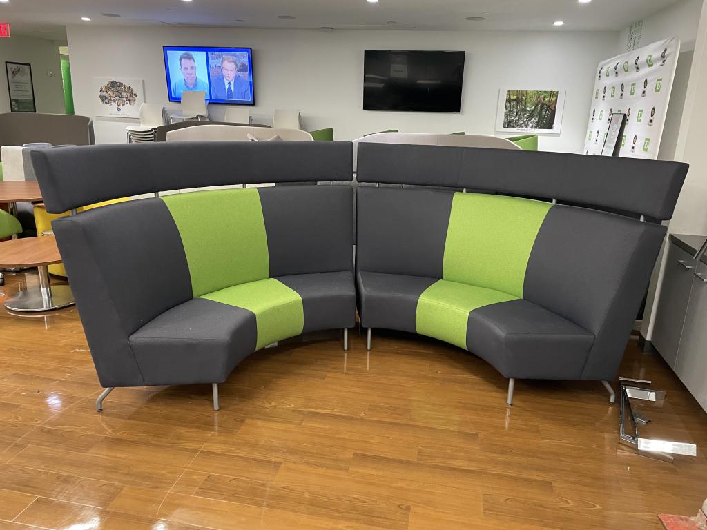 Description We have these Arcadia green apple and graphite curved sofa with high back. This high back sofa is modular and can be stacked into a half moon or full circle.