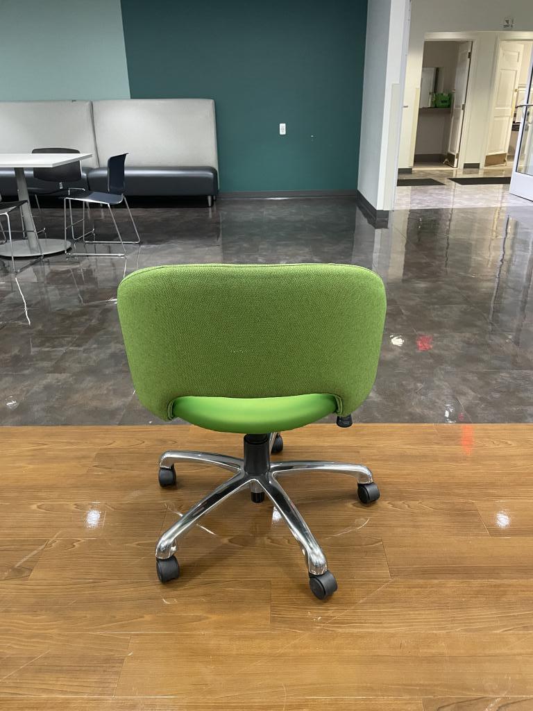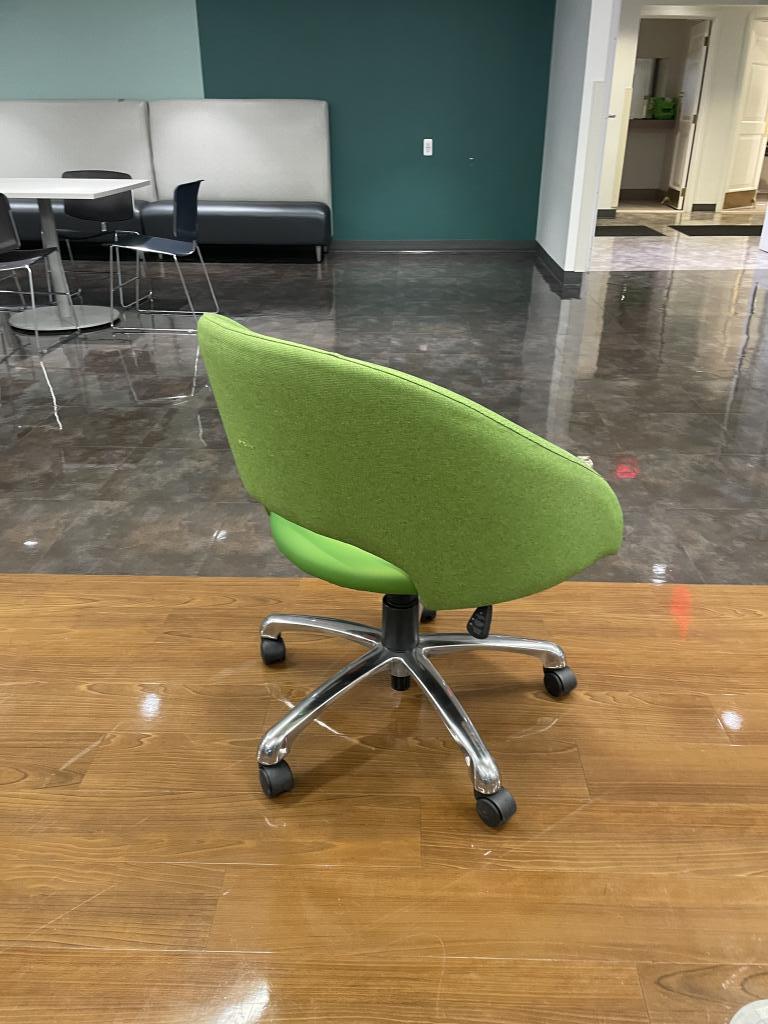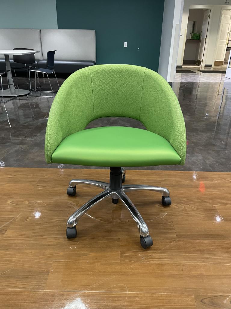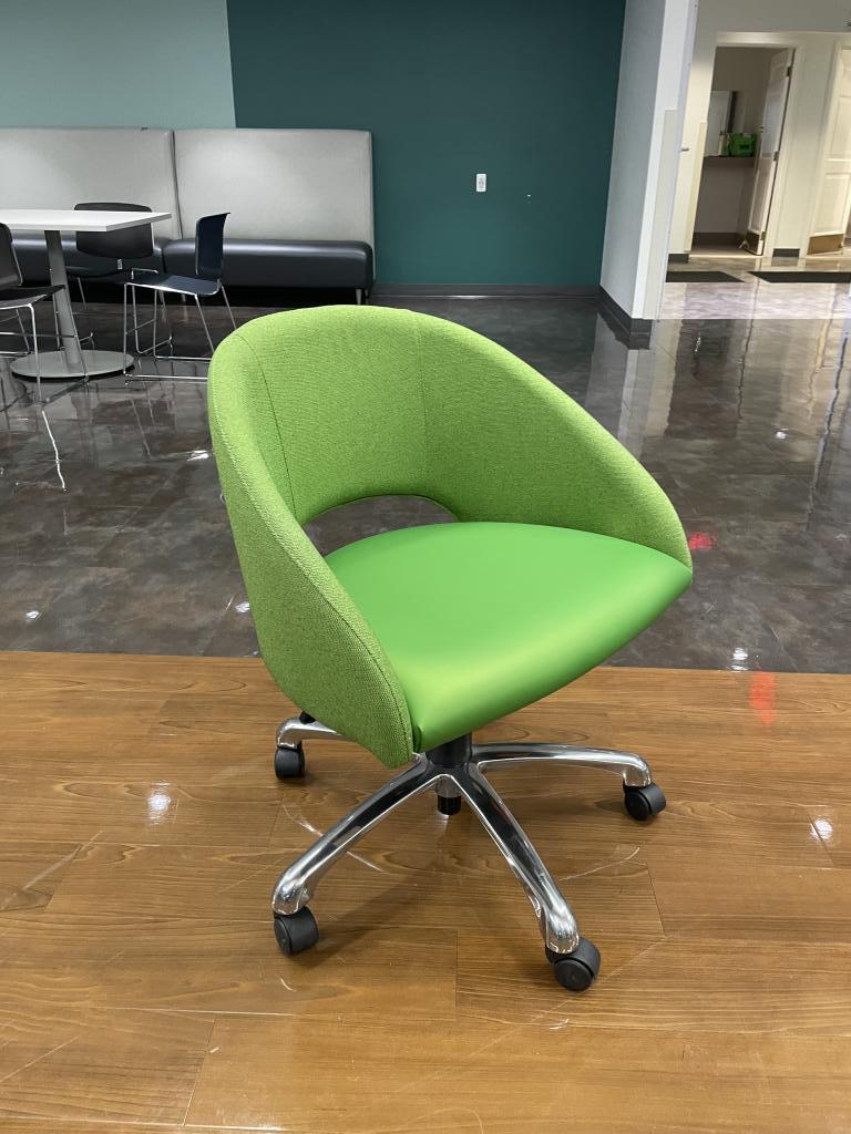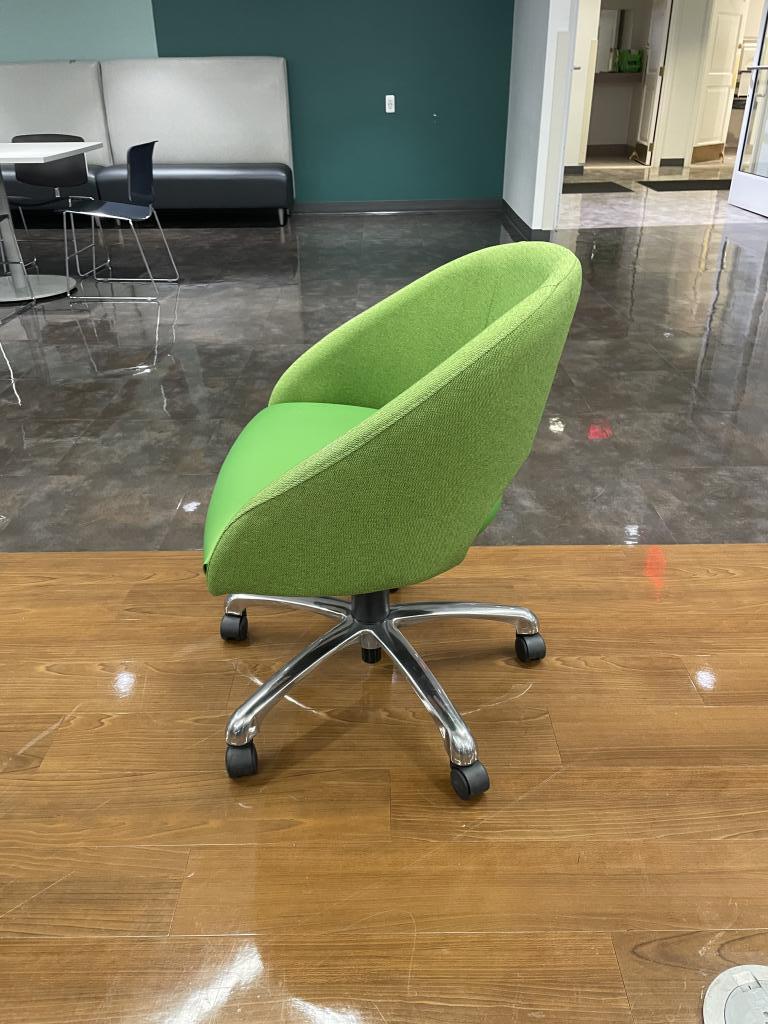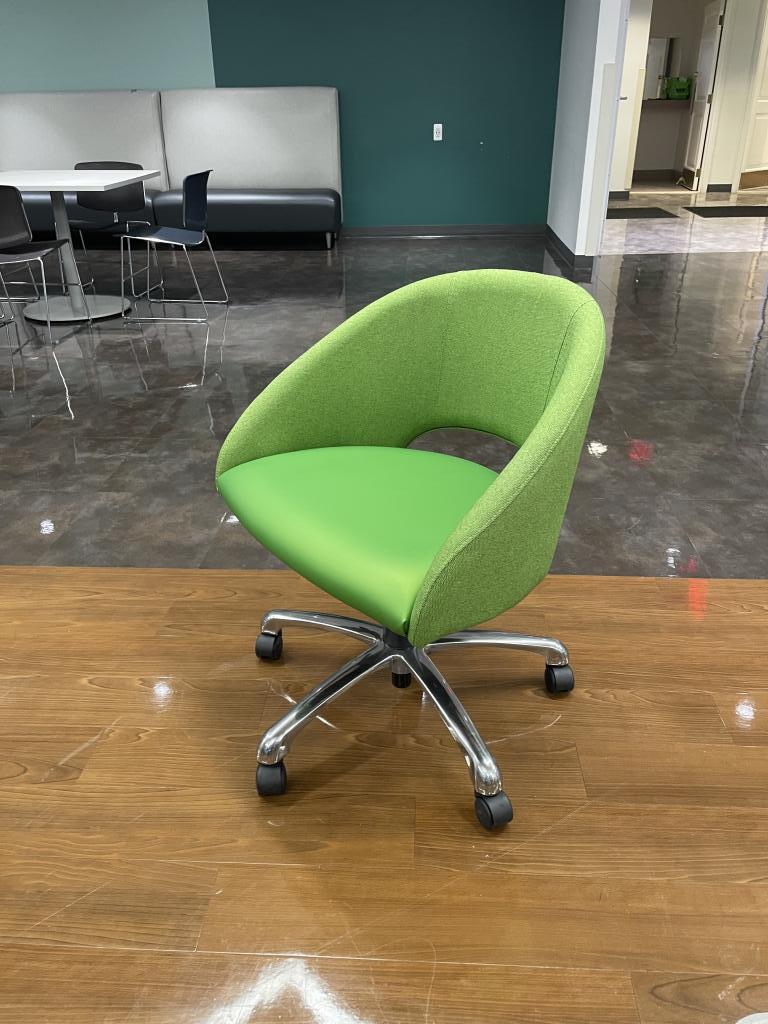 Description We have these green apple soft lounge chairs on chrome base with casters. They are very comfortable, light weight and would make a perfect conversation piece at any office or collaborative space.