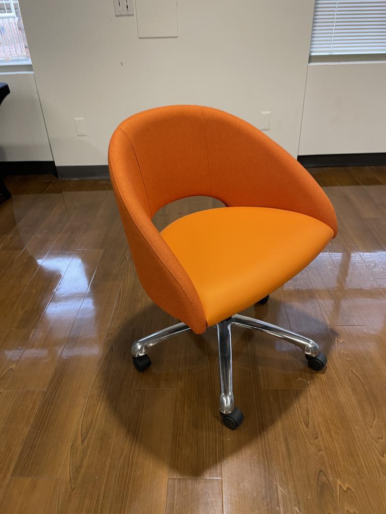 Description We have these orange Global soft lounge chairs on chrome base with casters. They are very comfortable, light weight and would make a perfect conversation piece at any office or collaborative space.