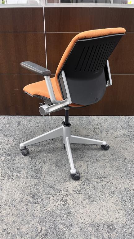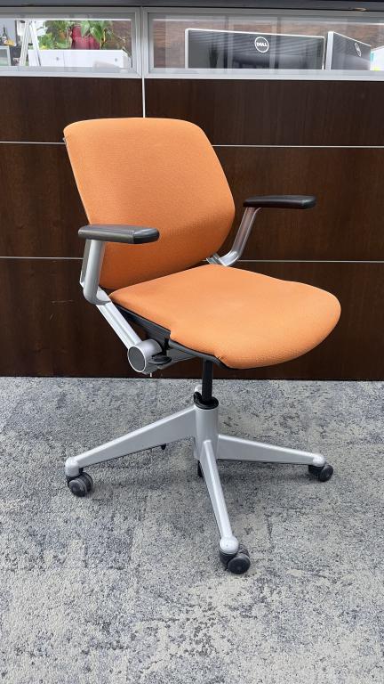 Description Pre-owned Vecta Nesting Task Chairs, with an orange fabric upholstery and sleek silver frame. These chairs are not only space-saving, with the ability to fold and nest neatly, but also offer adjustable height, swivel, and tilt functions for added comfort and versatility.