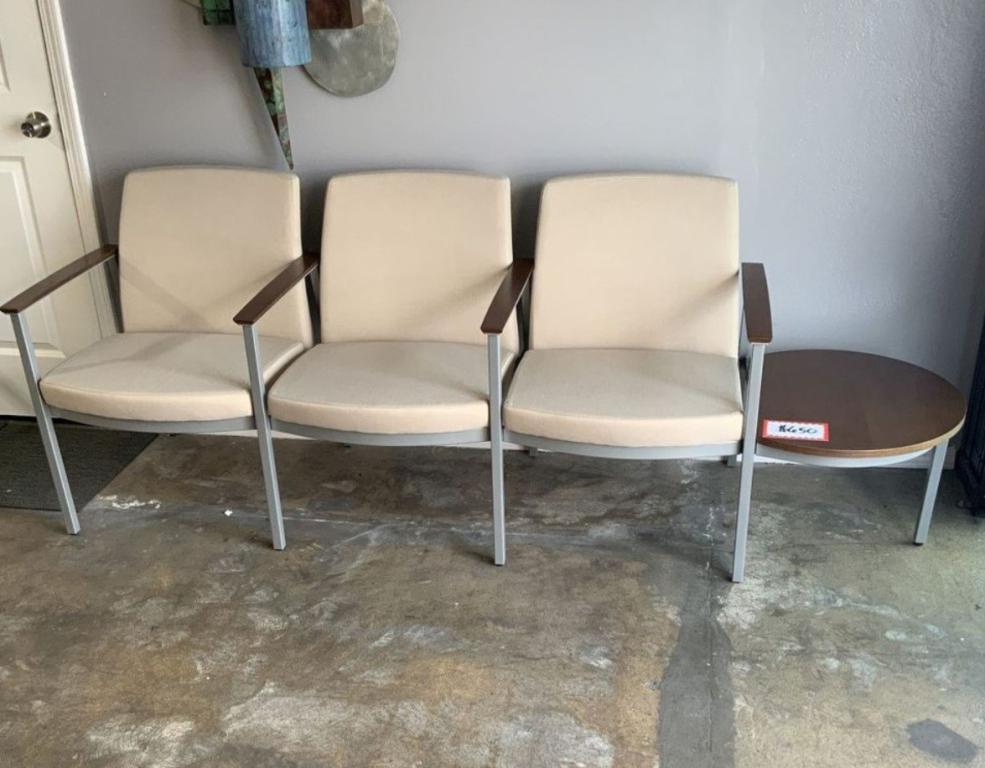 Description A row of three chairs with an end table. The chairs have beige dillion fabric which is antimicrobial and easy to clean. only one set is available.
