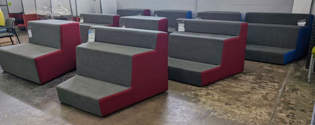 Description Our collaborate Gunlocke stairs are perfect for a modern day work environment. Offered in several different colors, to brighten up your space. Orange, red, blue, & green!