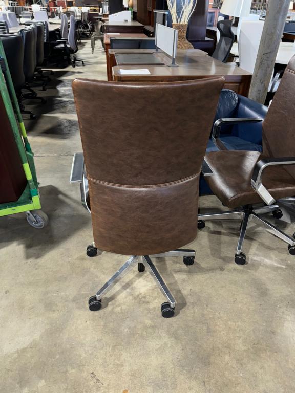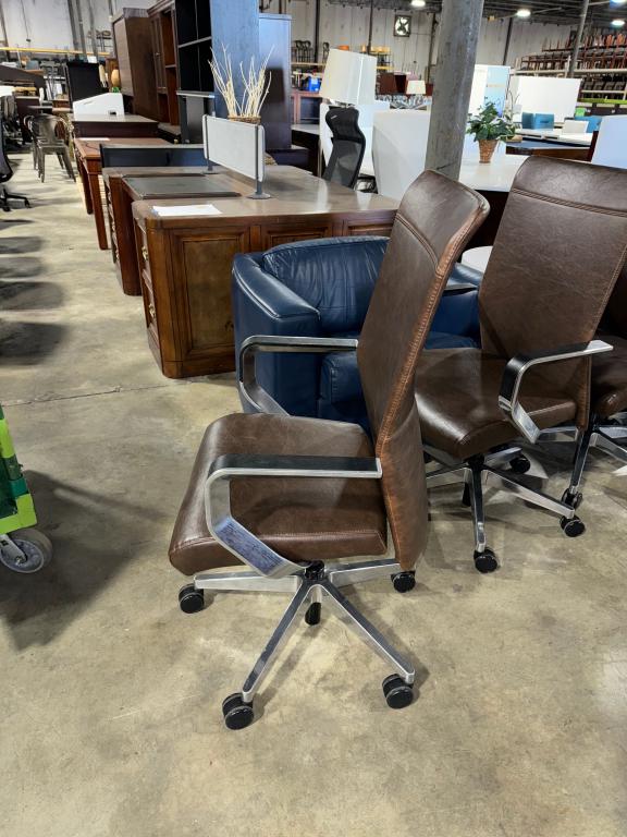 Description This pre-owned high-back task chair features upholstery in a brown washed leather, accented with subtle touches of black wheels and armrests, complementing the chrome hardware. Its chill industrial design not only ensures comfort but also delivers functionality. It's the perfect fusion of style and practicality, ideal for both workspace and home office settings.